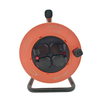 - 240V Cable Reel 25m 2.50mm (2x13A Sockets + Plug) – Features a heavy-duty 2.5mm cable, ideal for high-load and professional applications requiring maximum durability.