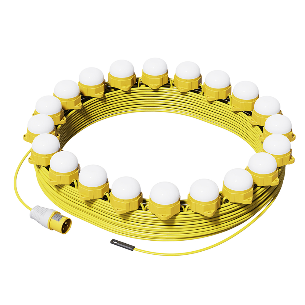 Connexion’s 110V LED Festoon Lighting Kit 50m 120W 16amp – (10933-50m) is an ideal solution for illuminating large outdoor spaces, construction sites, and events. This high-performance kit features 50 meters of LED lighting, delivering 120W of bright and energy-efficient illumination. The 16amp plug ensures secure power connection, making it perfect for heavy-duty use in work environments or temporary installations. Designed to provide wide coverage, this LED festoon lighting kit is both reliable and durable, ensuring consistent lighting even in demanding conditions. Whether it’s a festival, construction site, or outdoor project, this lighting kit provides the perfect solution for all your illumination needs.